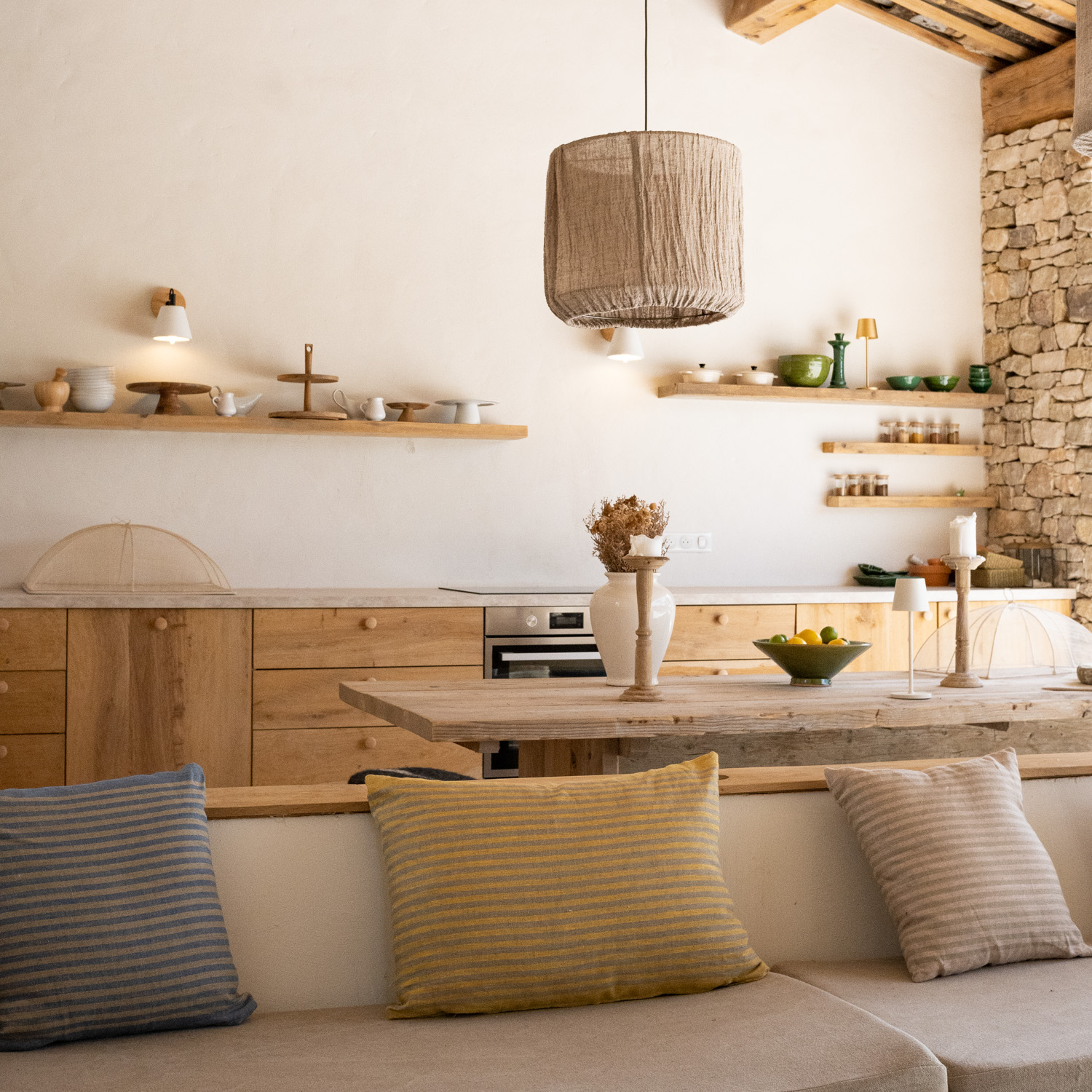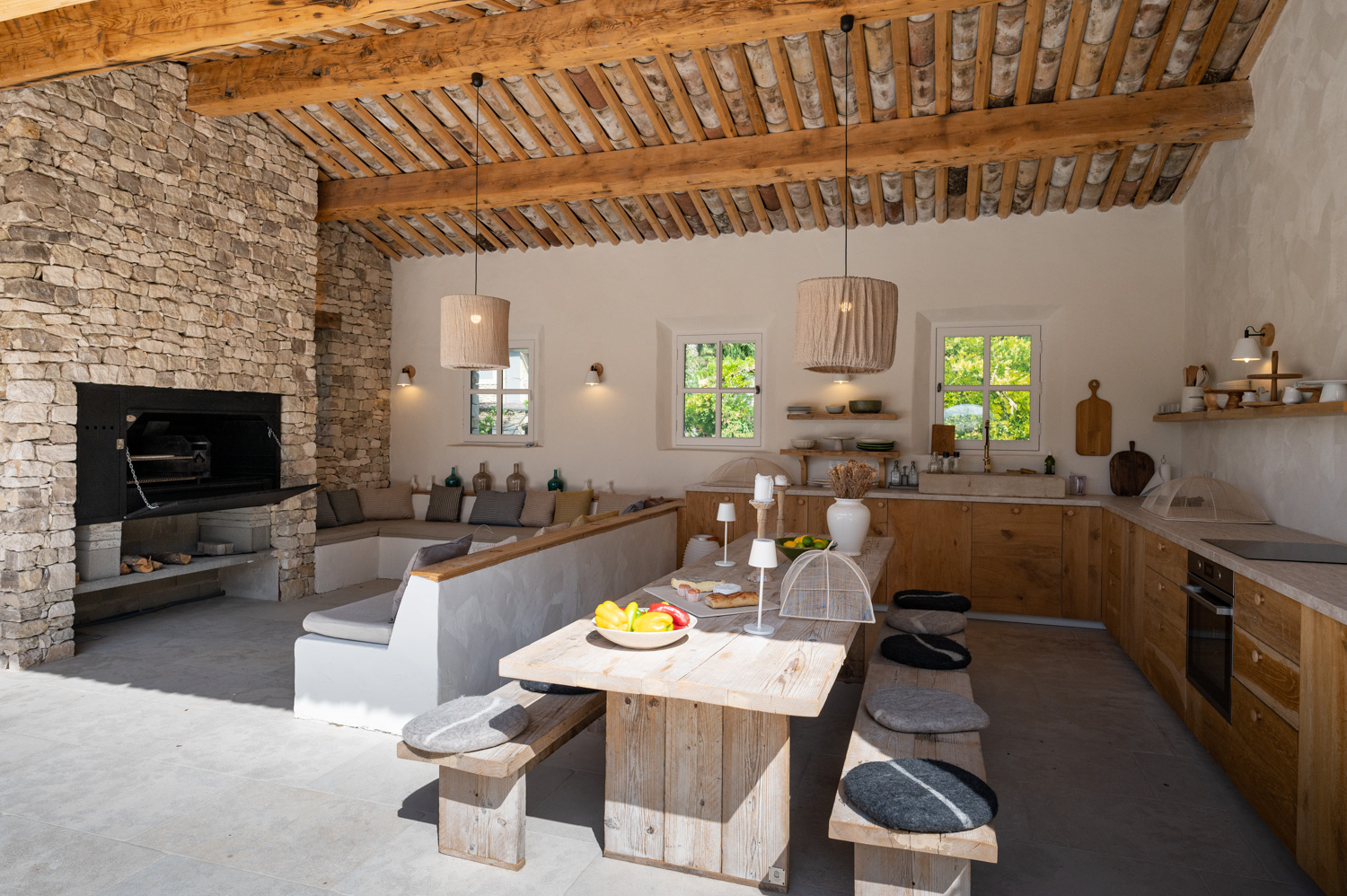 Le pavillon de la piscine est un espace dédié à la détente, avec une cuisine équipée, une salle à manger pour 12 convives, un barbecue « Brai » et un espace salon.